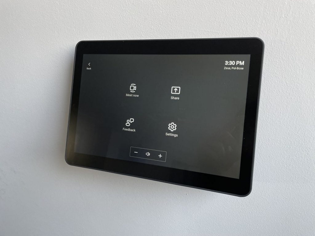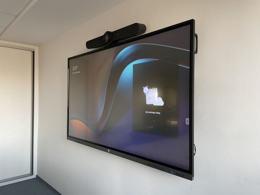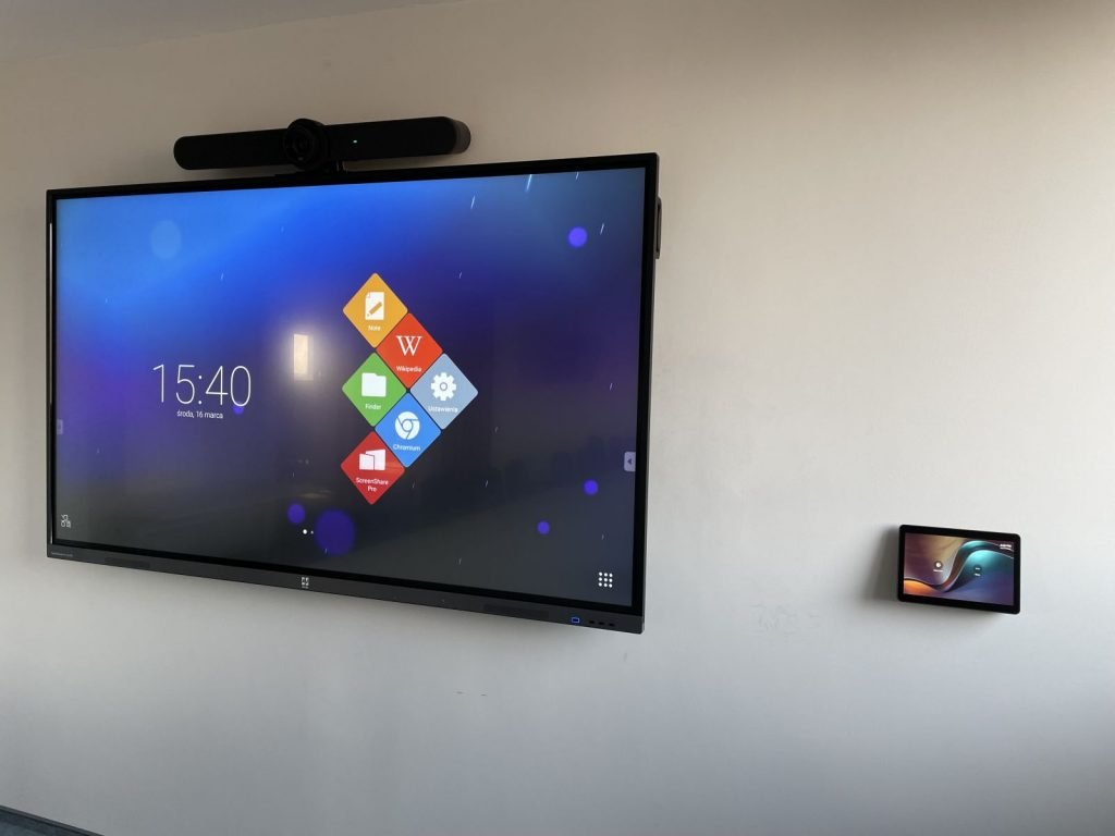 Taki sam zestaw został podłączony do Rally Bar w dużej sali, dzięki czemu możemy prezentować obraz z naszego laptopa lokalnie oraz podczas spotkań na Teams w sposób bezprzewodowy. Trzy dodatkowe mikrofony na suficie podwieszanym dbają o to, aby każdy z uczestników spotkania był doskonale i równomiernie słyszany przez uczestników zdalnych. Do sterowania wideokonferencją służy ekran dotykowy Logitech Tap zainstalowany na ścianie obok głównego wyświetlacza.