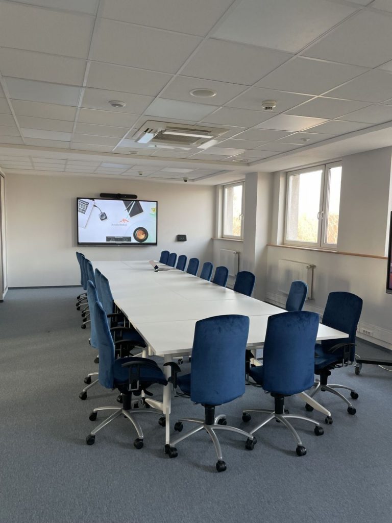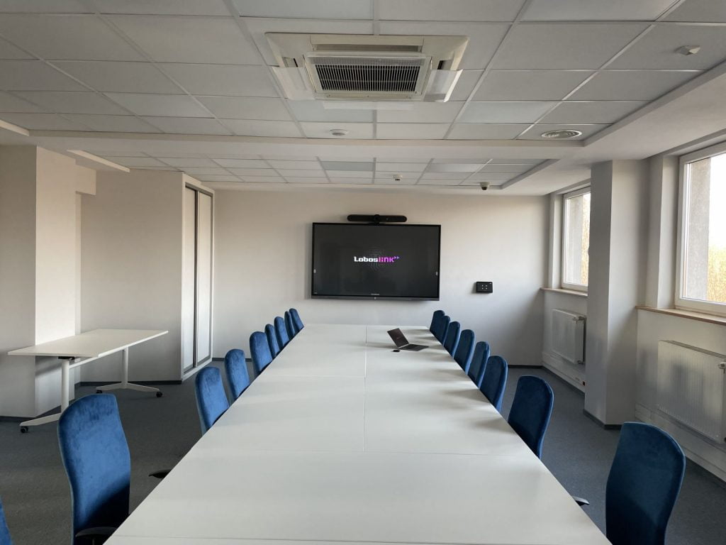 Rally Bar został zastosowany w dużej sali, która dodatkowo ma możliwość dołączenia dodatkowej przestrzeni poprzez rozsunięcie ściany działowej. Taki układ pomimo zastosowania monitora 86” wymagał dodatkowego podglądu dla osób siedzących na końcu sali. W tym celu zastosowaliśmy podwieszony pod sufitem monitor LG 55”. Może on za pomocą urządzeń Atlona oraz technologii HDbaseT wyświetlać ten sam obraz, który widzimy na głównym monitorze. Aby po rozdzieleniu sal również można było z niego skorzystać, został on wyposażony w lokalny zestaw Barco ClickShare C-10 do prezentacji bezprzewodowej.