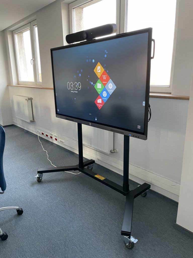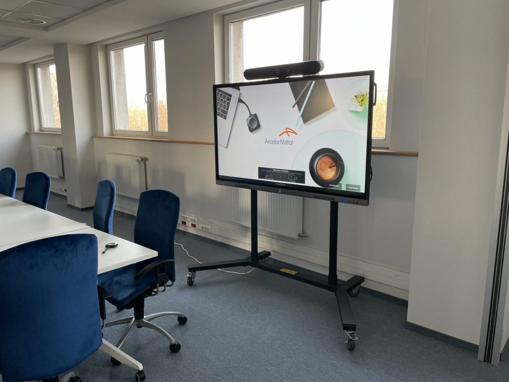 Jako że hybrydowy tryb pracy jeszcze ewoluuje i nie do końca wiadomo jak w praktyce będzie odbywała się praca w takim systemie, zaproponowaliśmy dołączenie do wyposażenia biura mobilnego zestawu wideokonferencyjnego. Zestaw ten dzięki łączności WiFi może być swobodnie przemieszczany między salami, ale może również być wykorzystany w przestrzeni open space oraz w projektowanej strefie coworkingu.