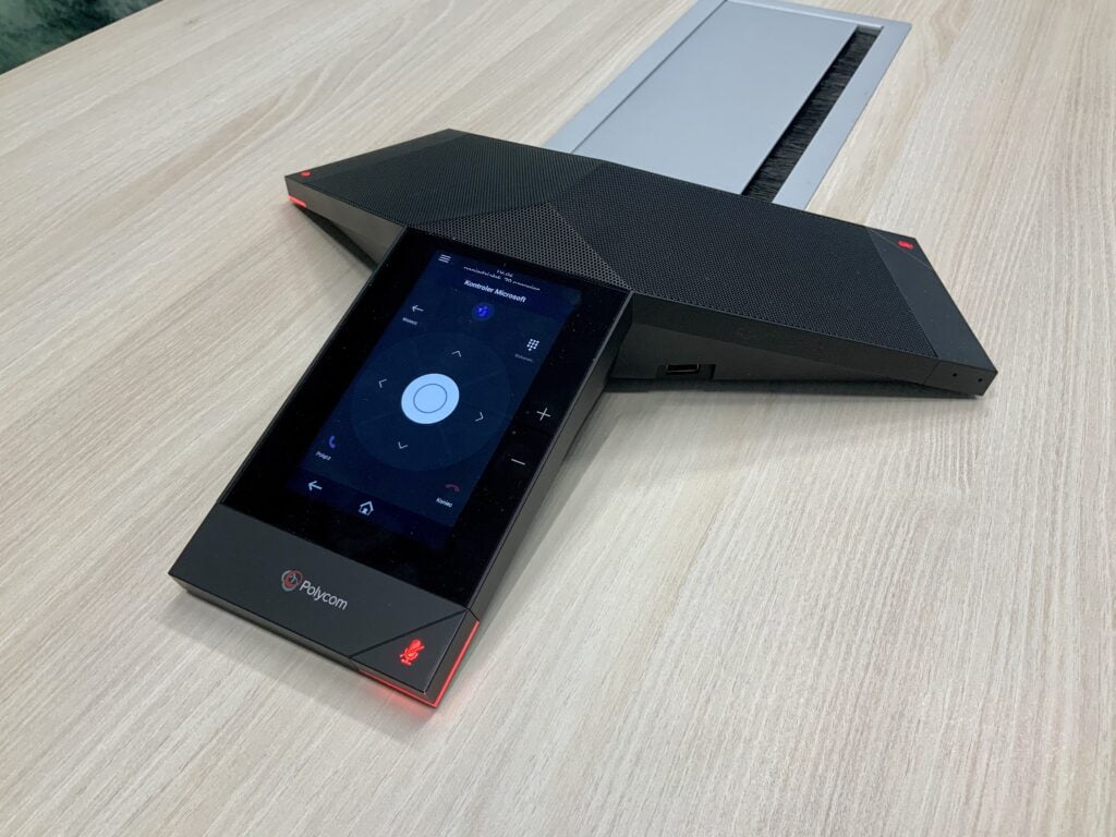 Tego typu urządzenia zwierają głośniki, mikrofony oraz kamerę. Jednym słowem wszystko co jest nam niezbędne do przeprowadzenia spotkania zdalnie. Polycom zaproponował dodatkowo możliwość zalogowania takiego urządzenia do Microsoft Teams czy Zoom.