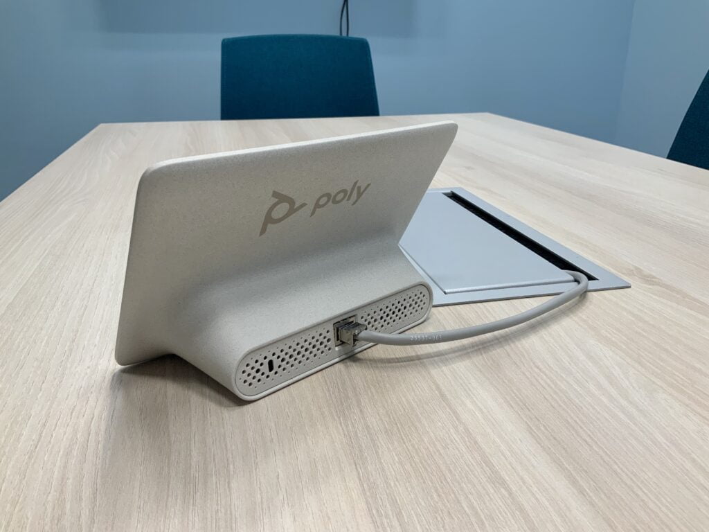 Standardowo przy zestawach Poly Studio X30 oraz X50 otrzymujemy monitor dotykowy jako panel sterowania. Podłączamy go po IP do Soundbaru za pomocą skrętki. Nie musimy dzięki temu ciągnąć dodatkowych kabli. Wystarczą prawdopodobnie istniejącej już w sali przyłącza internetowe.
