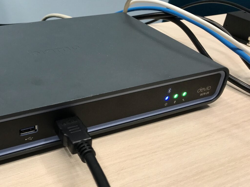 Biamp Devio wykonuje bardzo dużo czynności, aby nasze spotkania przebiegały gładko i z możliwe najlepszą jakością dźwięku. Brzmi to wszystko skomplikowanie natomiast finalnie dla użytkownika sali pozostaje wpięcie jednego kabla USB do swojego laptopa.