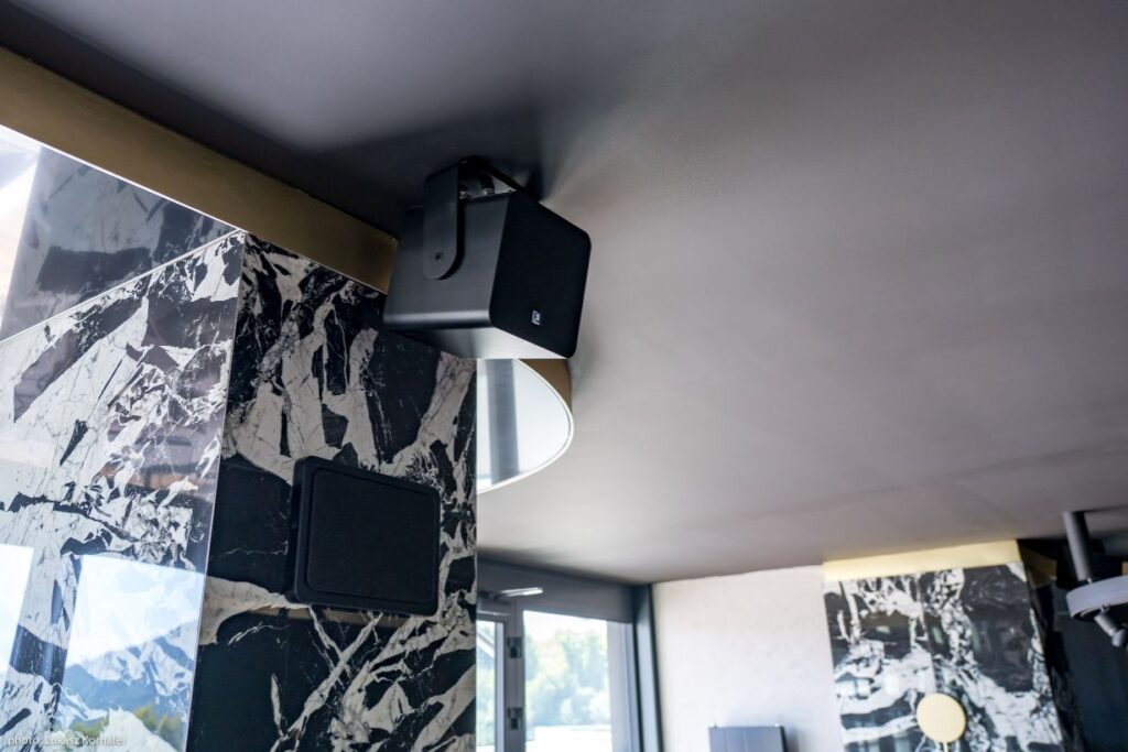 - Lobby i trasy komunikacyjne – głośniki sufitowe AUDAC CIRA824 (w bieli i czerni), odpowiedzialne za równomierne pokrycie dźwiękiem w reprezentacyjnych ciągach komunikacyjnych.