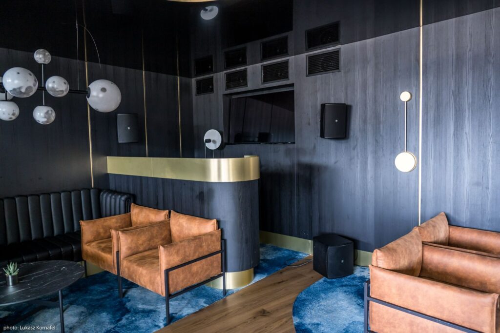 - WOW Bar – przestrzeń od pierwszej kawy po nocne koktajle, nagłośniona CIRA824 w kolorze czarnym, zasilana z centralnych wzmacniaczy AUDAC PMQ.