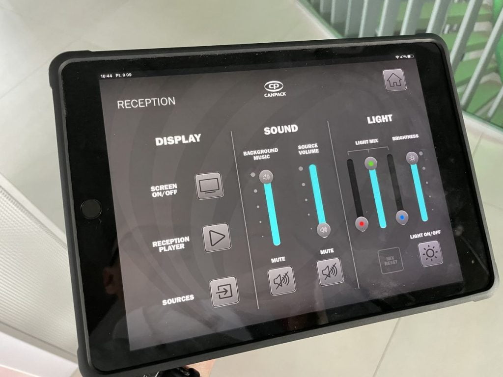 Jedną z najbardziej istotnych zalet całego systemu AV jest jego elastyczność i łatwość obsługi. Jego głównym założeniem było, żeby pracownicy mogli dostosować przestrzeń do swoich potrzeb. Do naszych zadań należało umożliwienie wysyłania dowolnych sygnałów (zarówno audio, jak i wideo) z każdego miejsca, na każdy znajdujący się w biurze monitor. Do zarządzania całą przestrzenią służą tablety iPad. Za sterowanie urządzeniami odpowiada system Creston VT4. Na potrzeby naszego klienta zaprojektowaliśmy prosty w obsłudze interfejs użytkownika, który umożliwia wybór strefy, głośność, źródła sygnału audio i wideo oraz rodzaj oświetlenia.