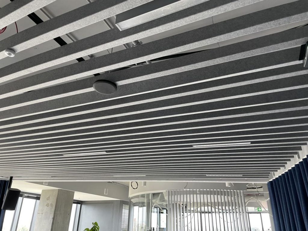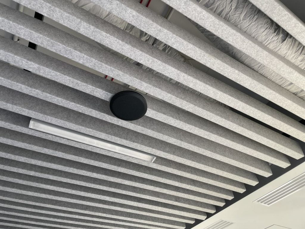 W przestrzeni biznesowej CANPACK zainstalowaliśmy system nagłośnieniowy oparty na rozwiązaniach Biamp. Zastosowaliśmy procesor TesiraForte AVB CI, trzy rodzaje głośników oraz wzmacniacze TesiraXEL 1200.1 w sali kinowej i Tesira AMP-450P w mniejszych pomieszczeniach. Głośniki zostały dostosowane do rodzaju miejsca. Wykorzystaliśmy głośniki zwieszane Biamp Desono P60DT, a w recepcji, gdzie zastosowano podwieszany sufit, zabudowaliśmy głośniki Biamp Desono C-IC6. Sala kinowa wymagała większych urządzeń, dlatego trafiły tu duże głośniki ścienne wsparte subwooferem.